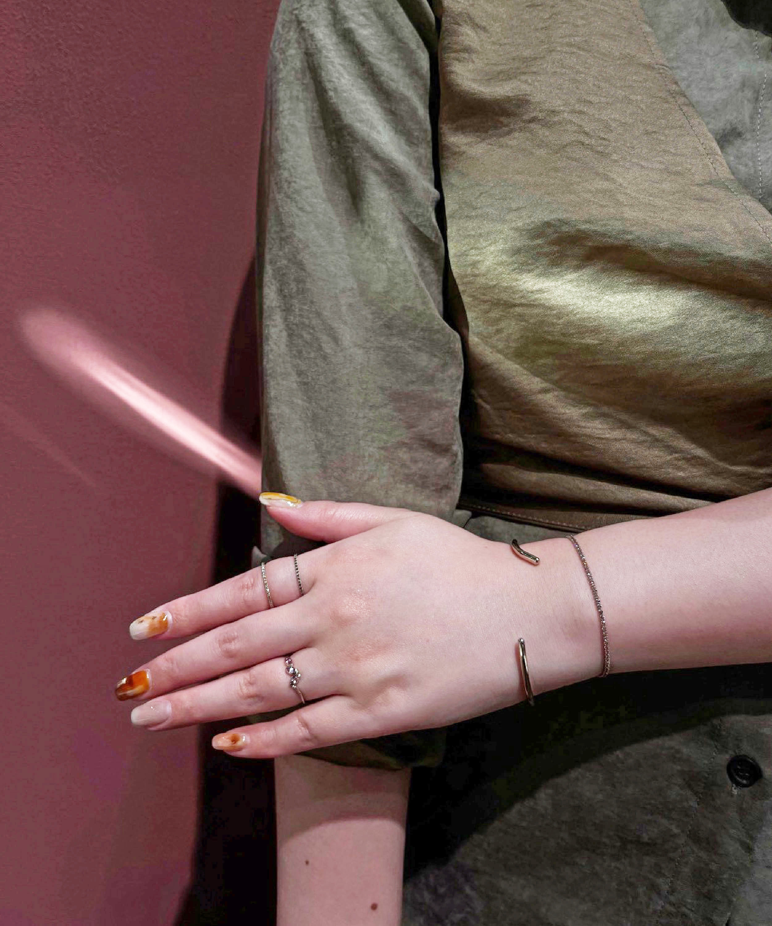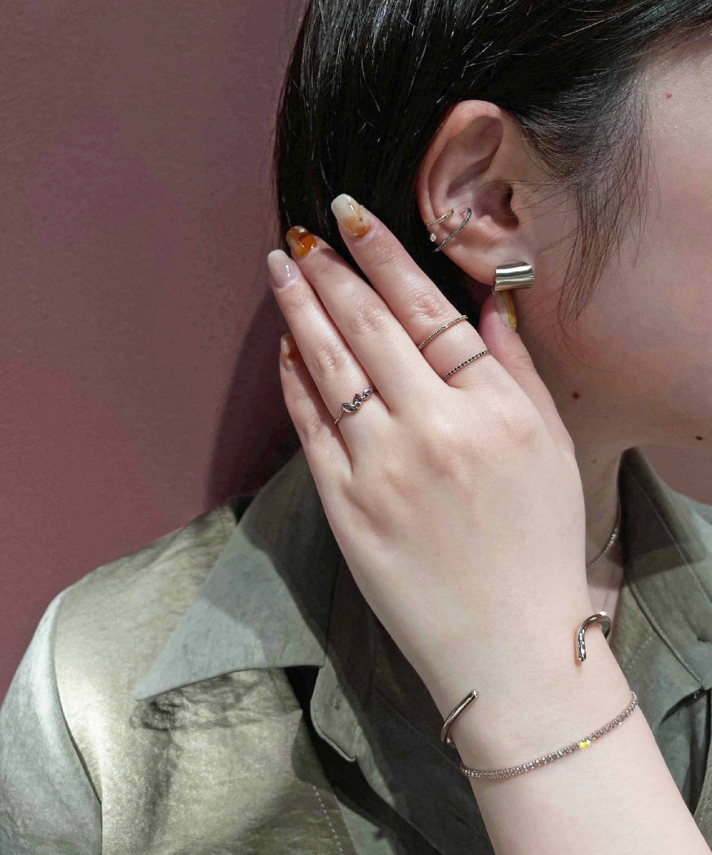 項鍊的寶石點亮了鎖骨間的柔和光澤,與戒指相互呼應。 米金色調襯托整體層次,在日常與正式之間,展現溫柔而自信的女性魅力。