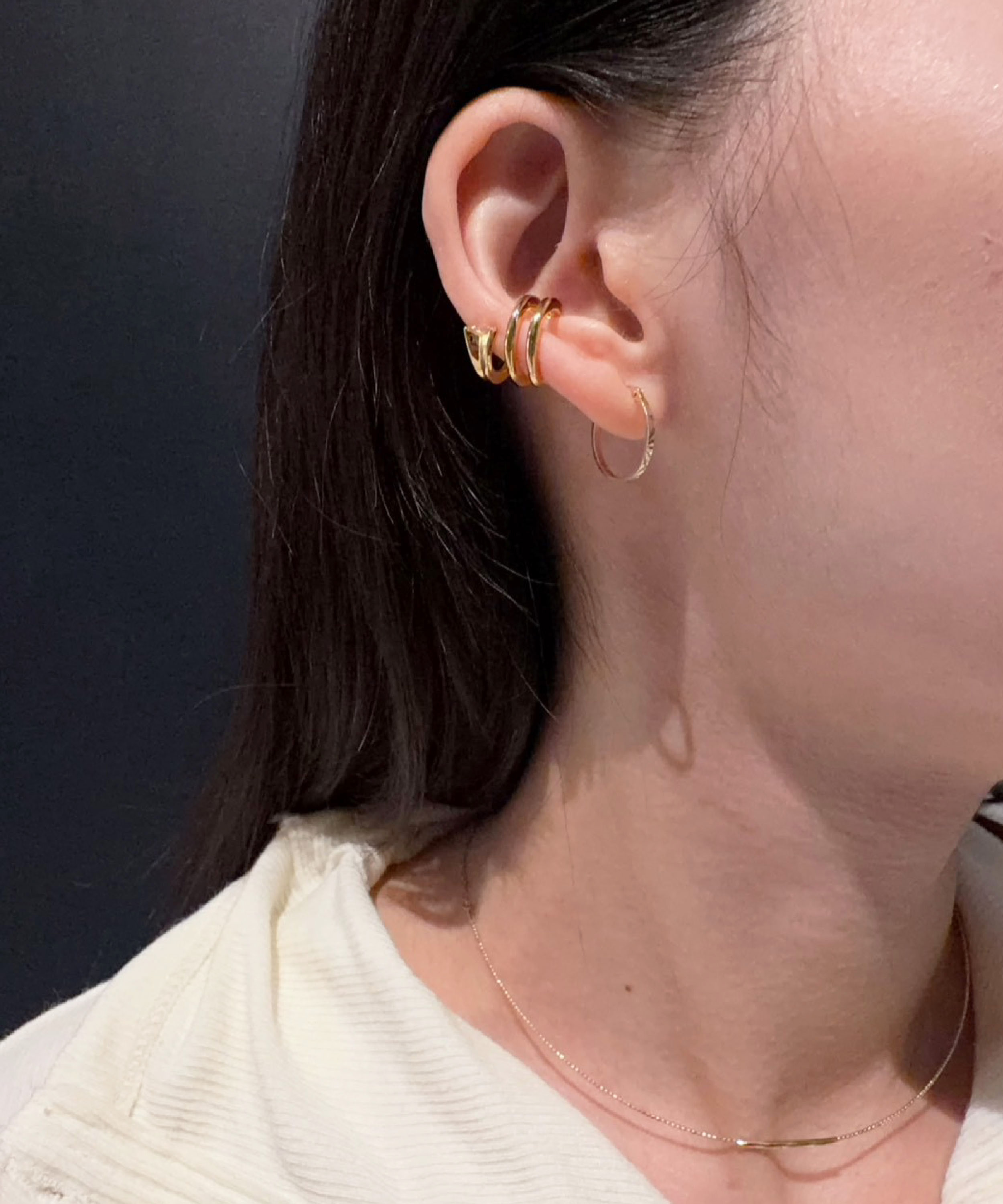以溫潤金色系串連整體穿搭,曲面鑽腕錶在腕間低調閃耀。 柔軟的米色針織與俐落金屬線條相互平衡,讓簡單服裝多了一份細緻質感, 讓整體色彩自然延展,呈現乾淨而有層次的質感。