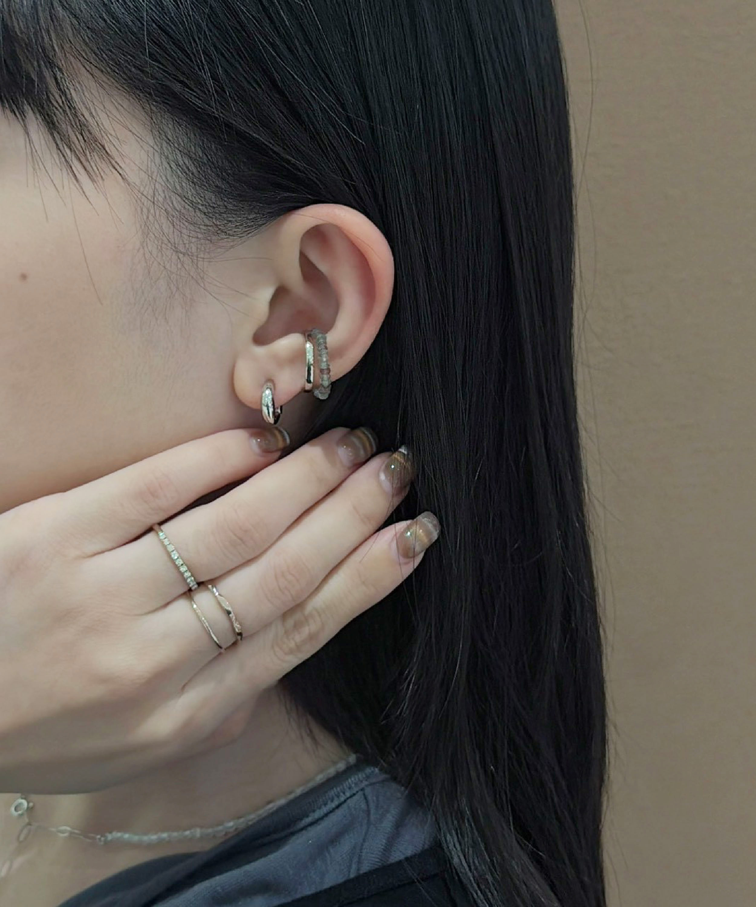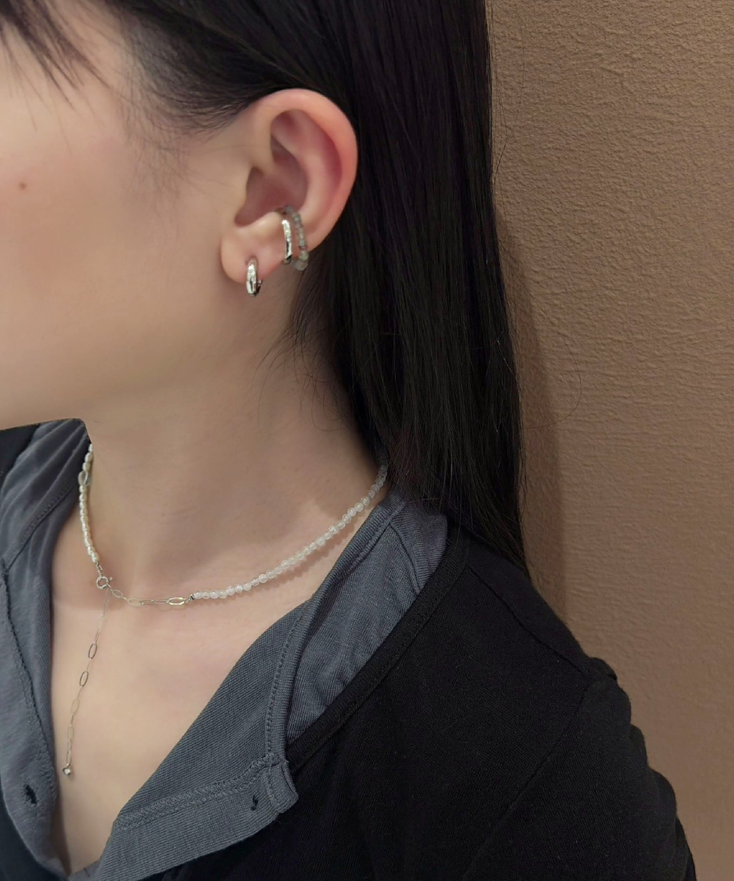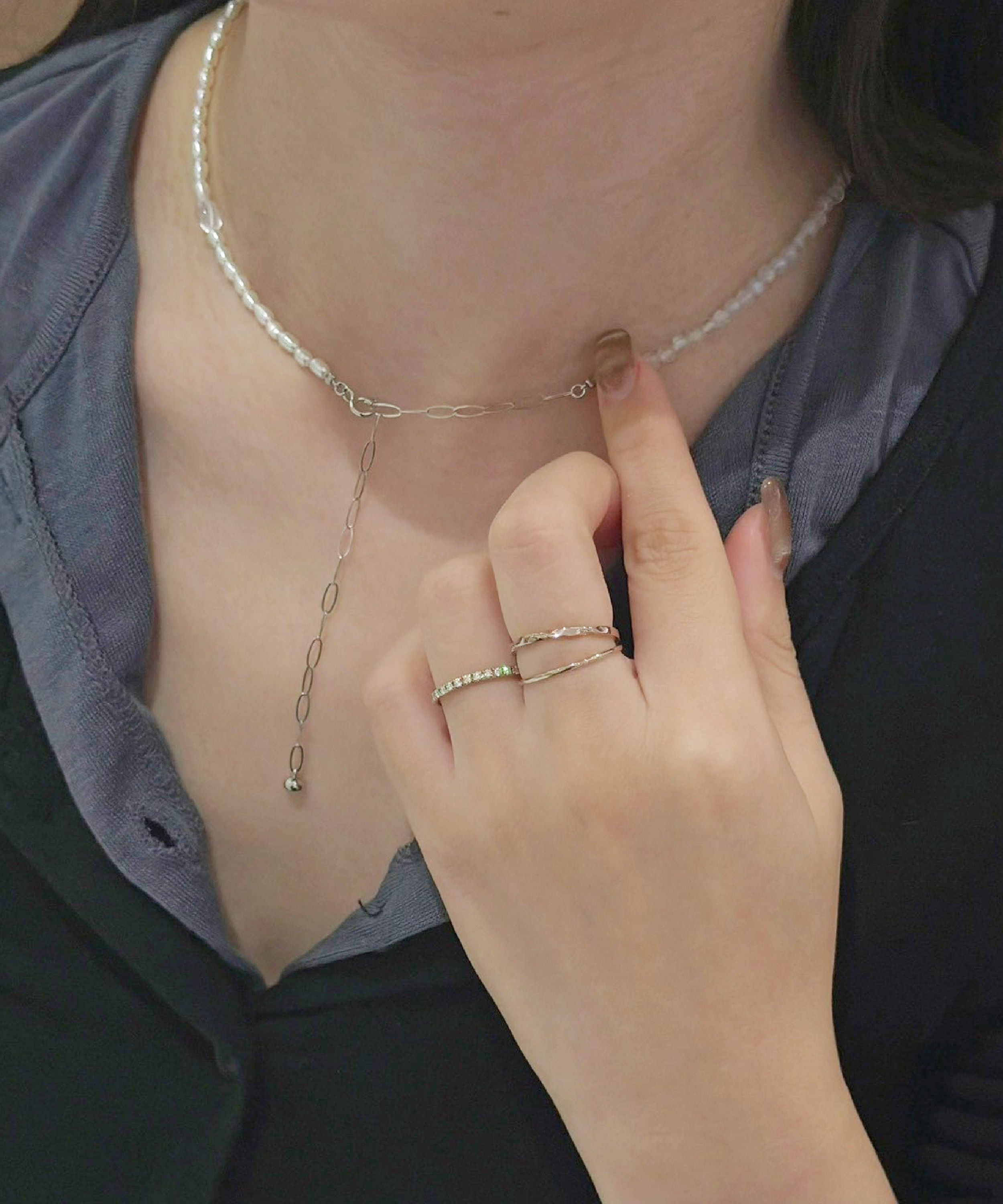脖頸間透明的天然石與珍珠的光澤對比,以及鍊尾點綴不規則銀色圓珠, 整體風格呈現個性俏皮感,也能利用不同長度隨意展現多樣穿搭風格。