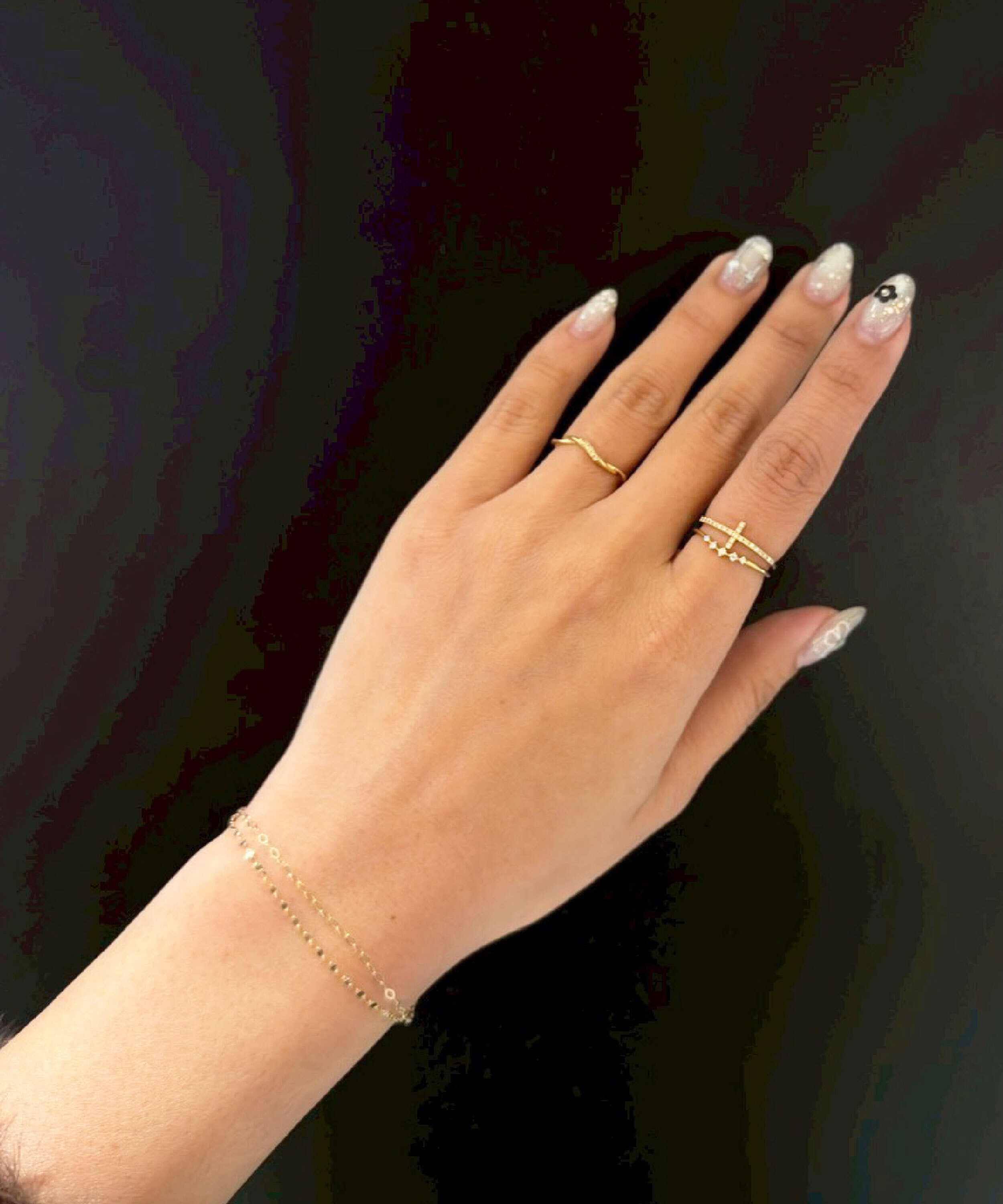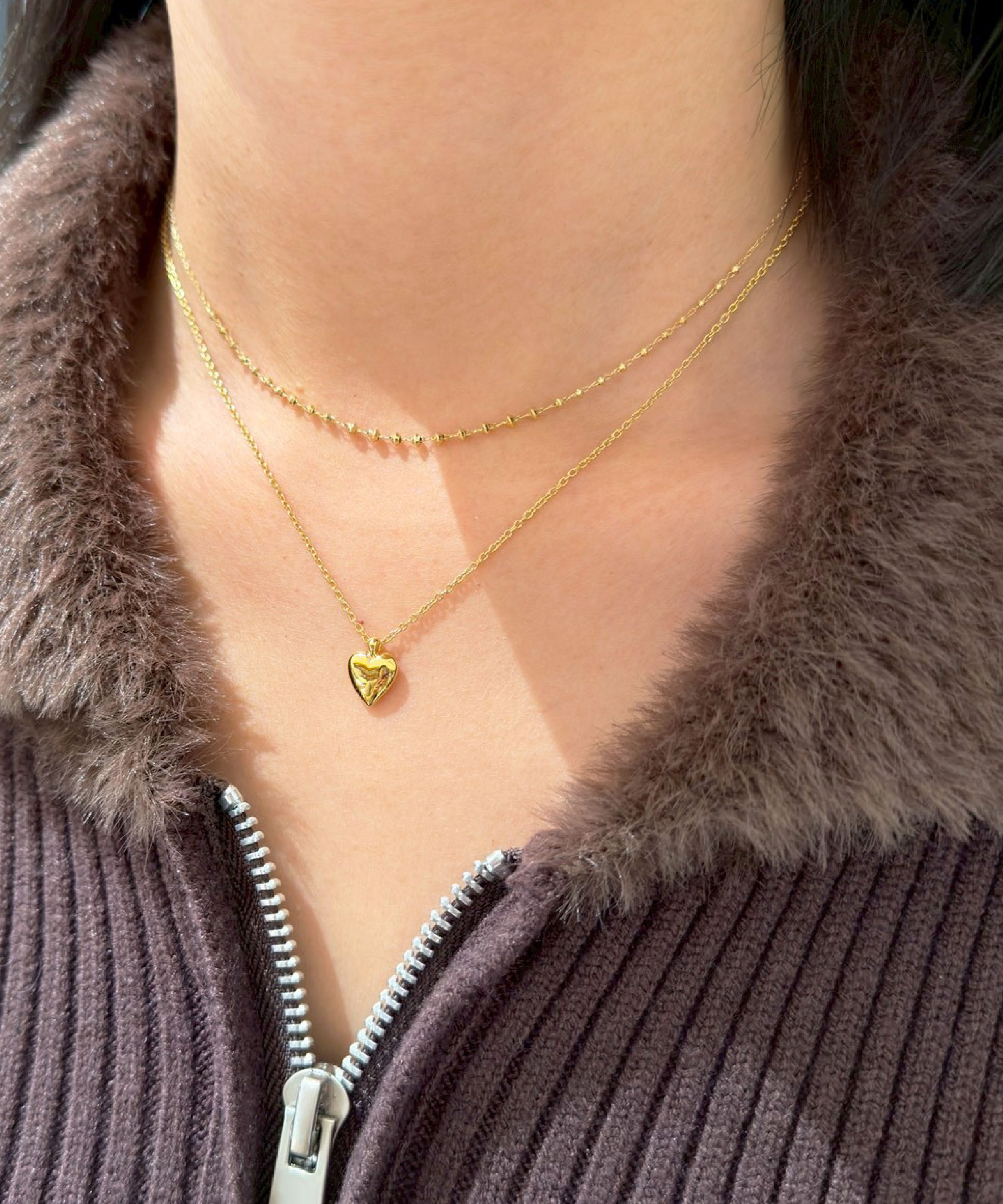 以愛心為主題的項鍊與耳環,將情感化作細緻光澤,低調卻不失存在感。 耳畔小巧的愛心設計則呼應整體造型,在不經意的側臉間流露細膩心意。