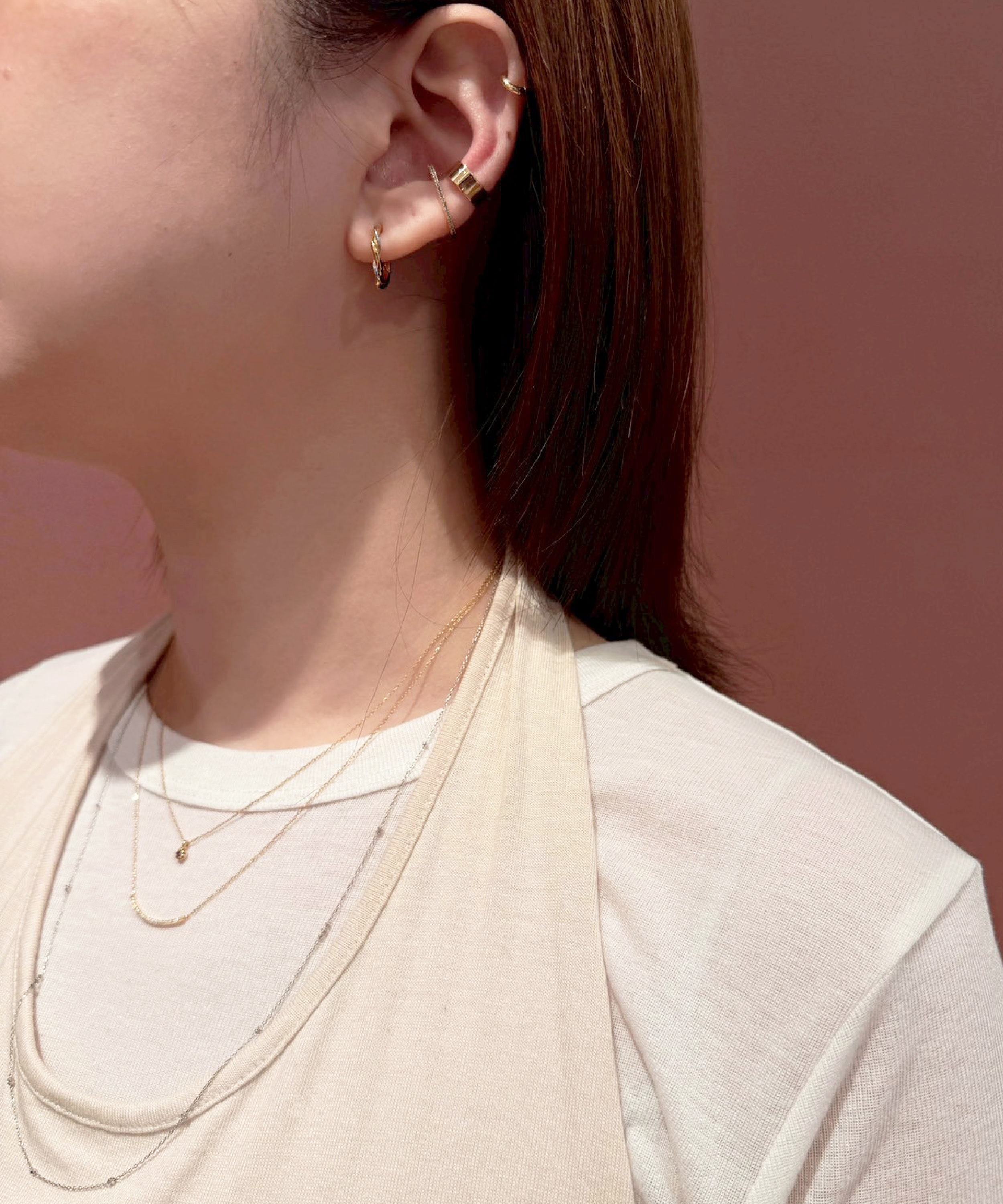 Lucent系列 K18YG 微光耳釦俐落的拋光線條為耳際打造存在感。 搭配細圈與鑲鑽耳釦層疊,透過粗細對比,打造低調卻有個性的日常耳飾造型。
