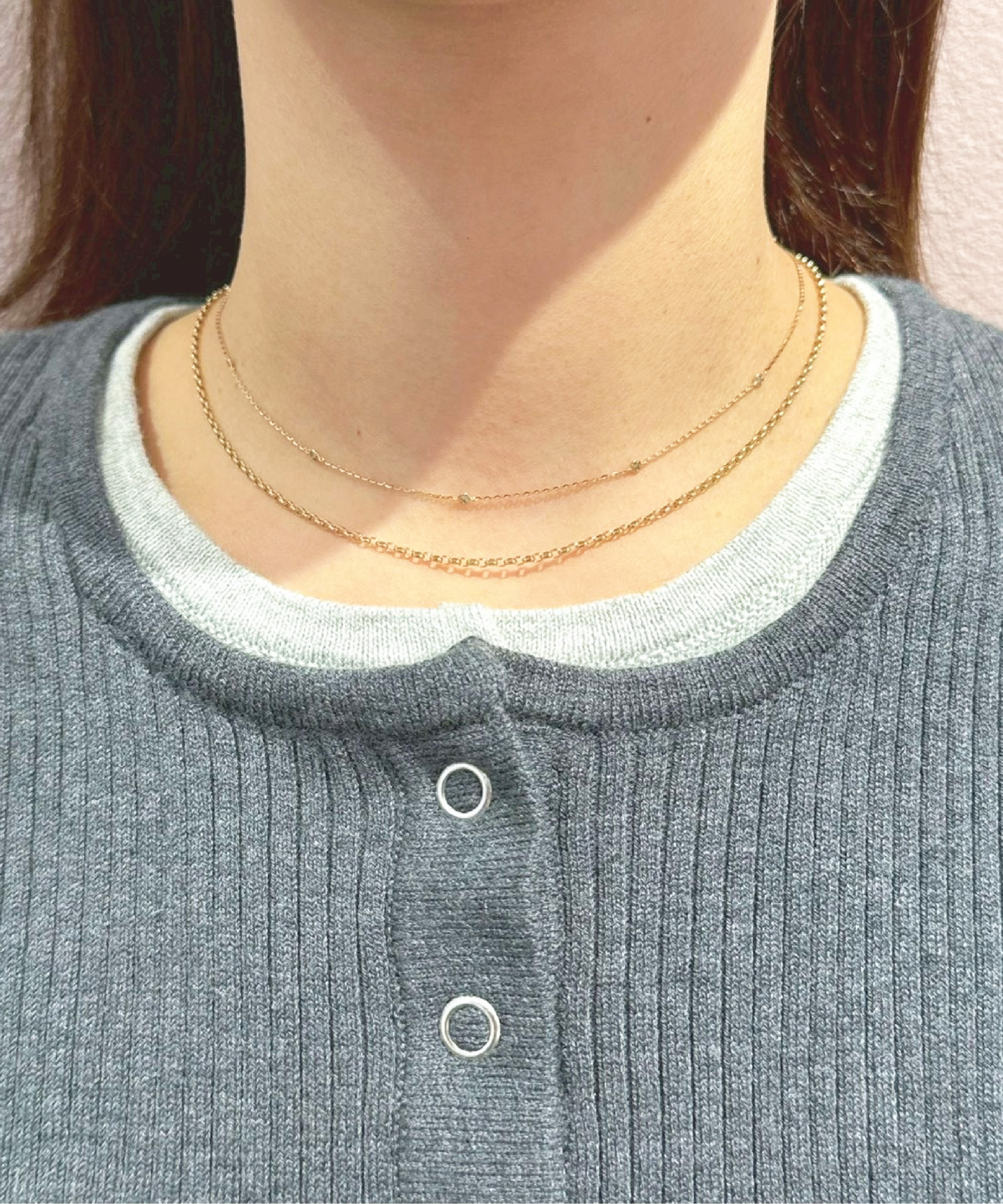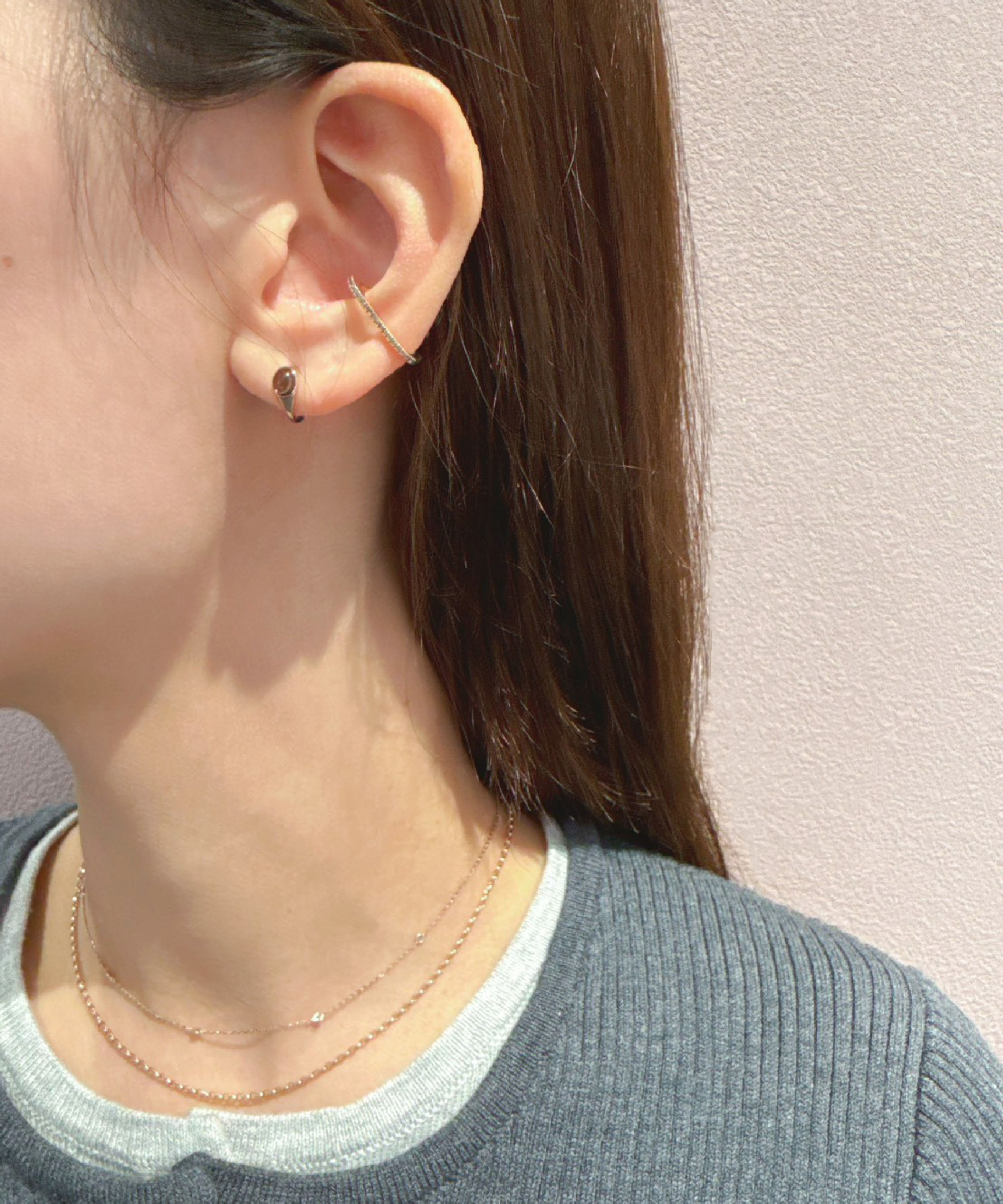 米金色的雙指戒成為手部焦點,線條俐落卻不張揚。 搭配同色系耳環與小豆跳躍項鍊,讓整體穿搭多一點層次感。