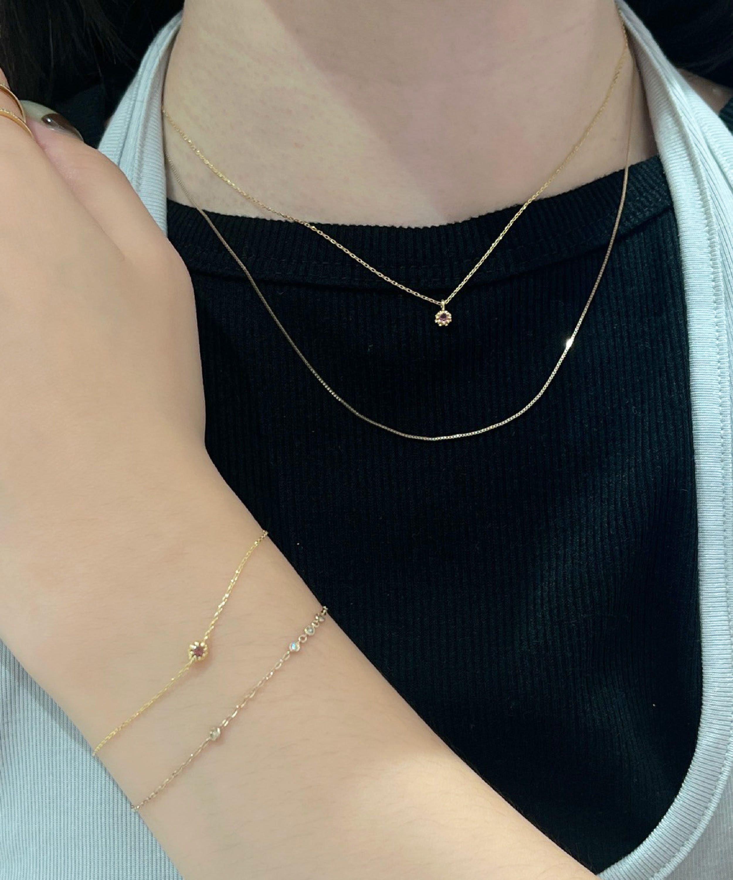 以纖細的K18金鍊身串起粉紅碧璽的溫柔光芒,將愛與療癒悄悄留在日常,再與米金色威尼斯項鍊輕巧疊搭,低調卻閃耀。 粉紅碧璽除了可以當作愛情幸運石,同時也適合用來提升人際關係與內心的柔軟能量。