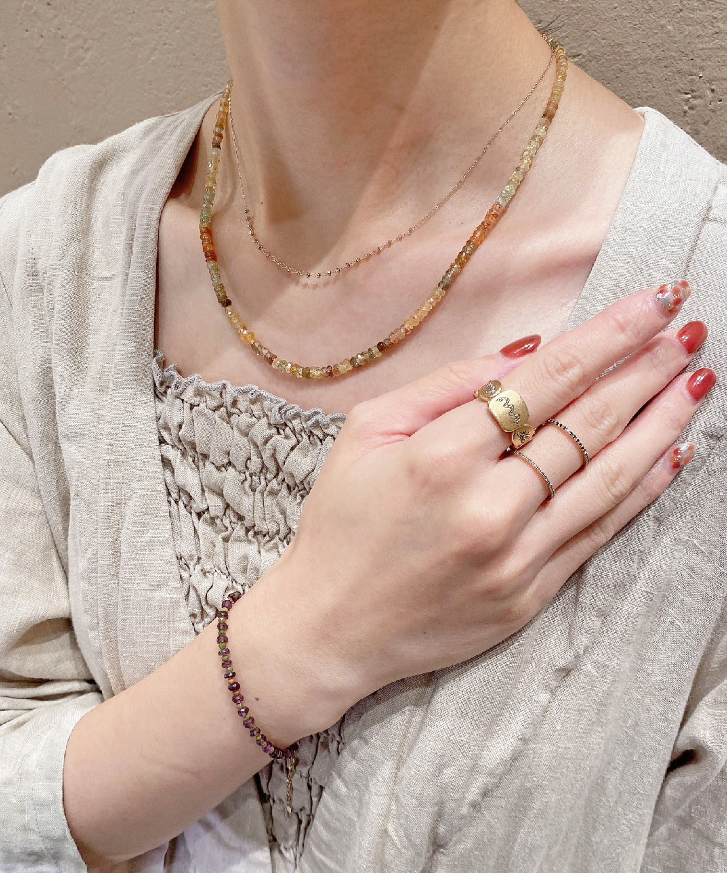 色彩斑斕的寶石與低調奢華的米金搭配,用不同元素強調線條的粗細,疊戴出細膩的層次感,而手部的搭配藉由古董風格的質感與摩登現代的設計碰撞,綻放獨特的個人魅力。