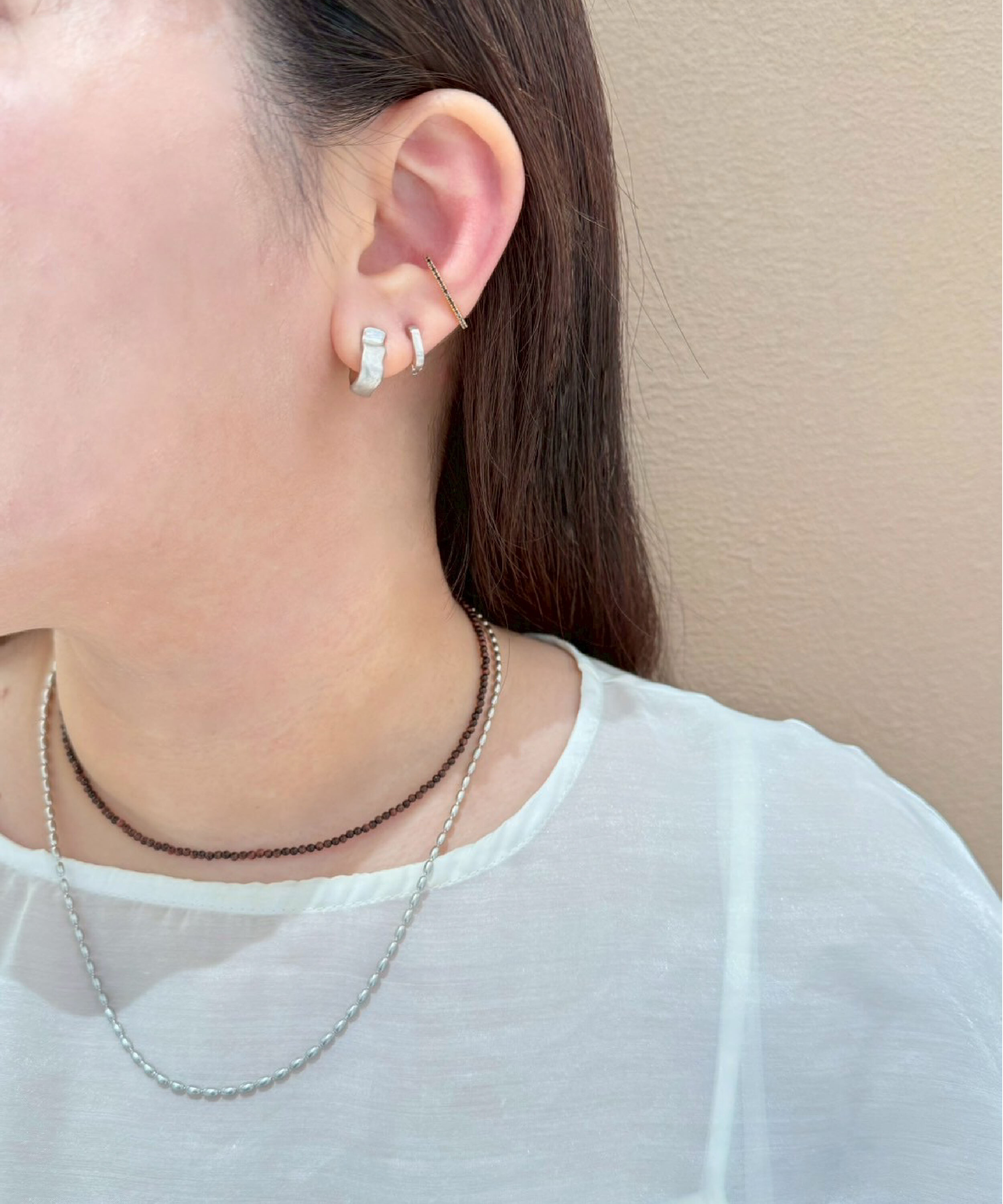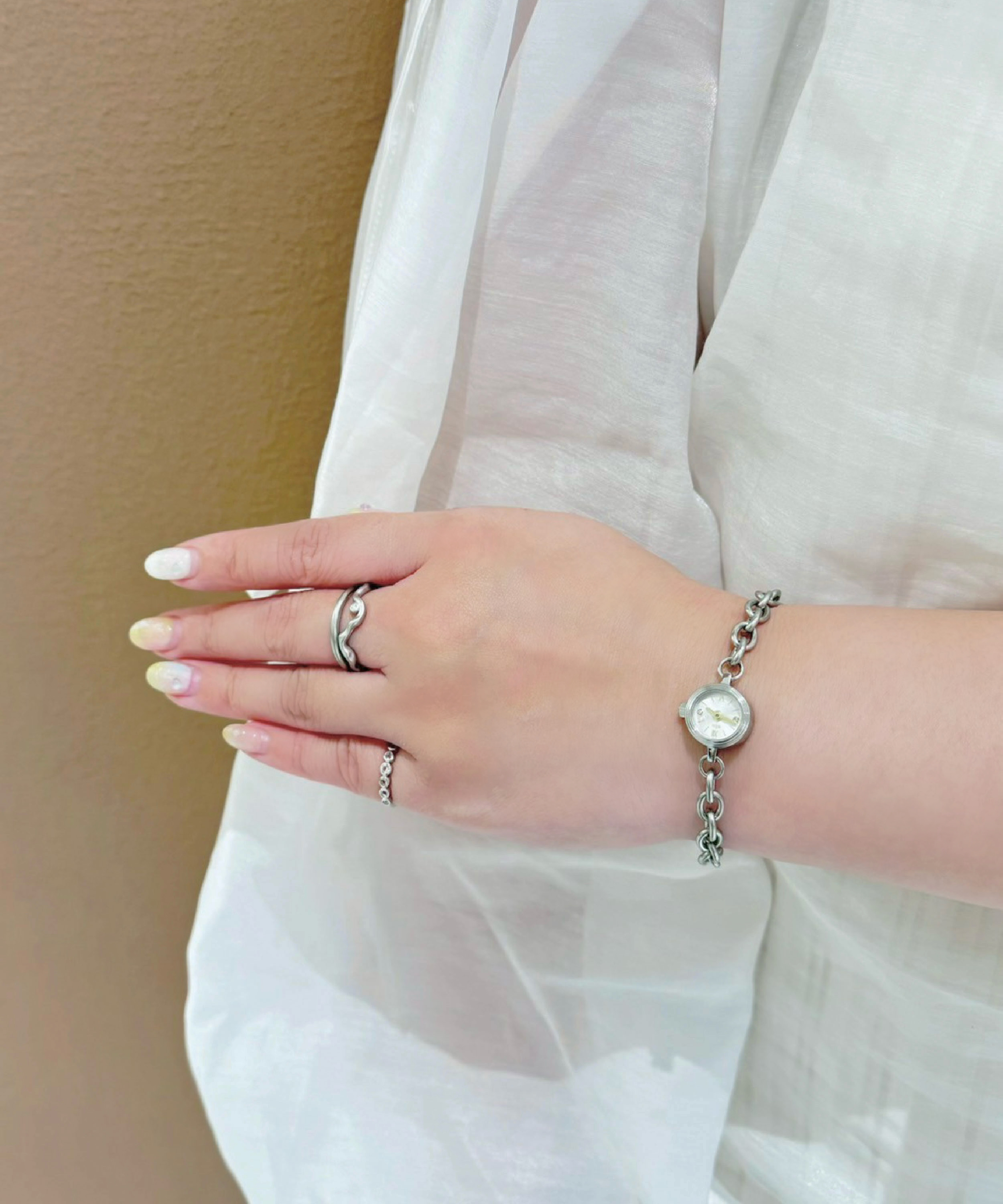 以「Knead」為主題,以黏土為靈感透過仿手捏成形的紋理,設計出點綴細緻鑽石的許願骨造型戒指, 層疊搭配獨特細緻的髮絲紋鉑金戒指,展現時髦簡約的氛圍, 尾戒配戴擁有櫻花粉光芒的摩根石寶石戒指,讓整體散發出隨性柔和的魅力。