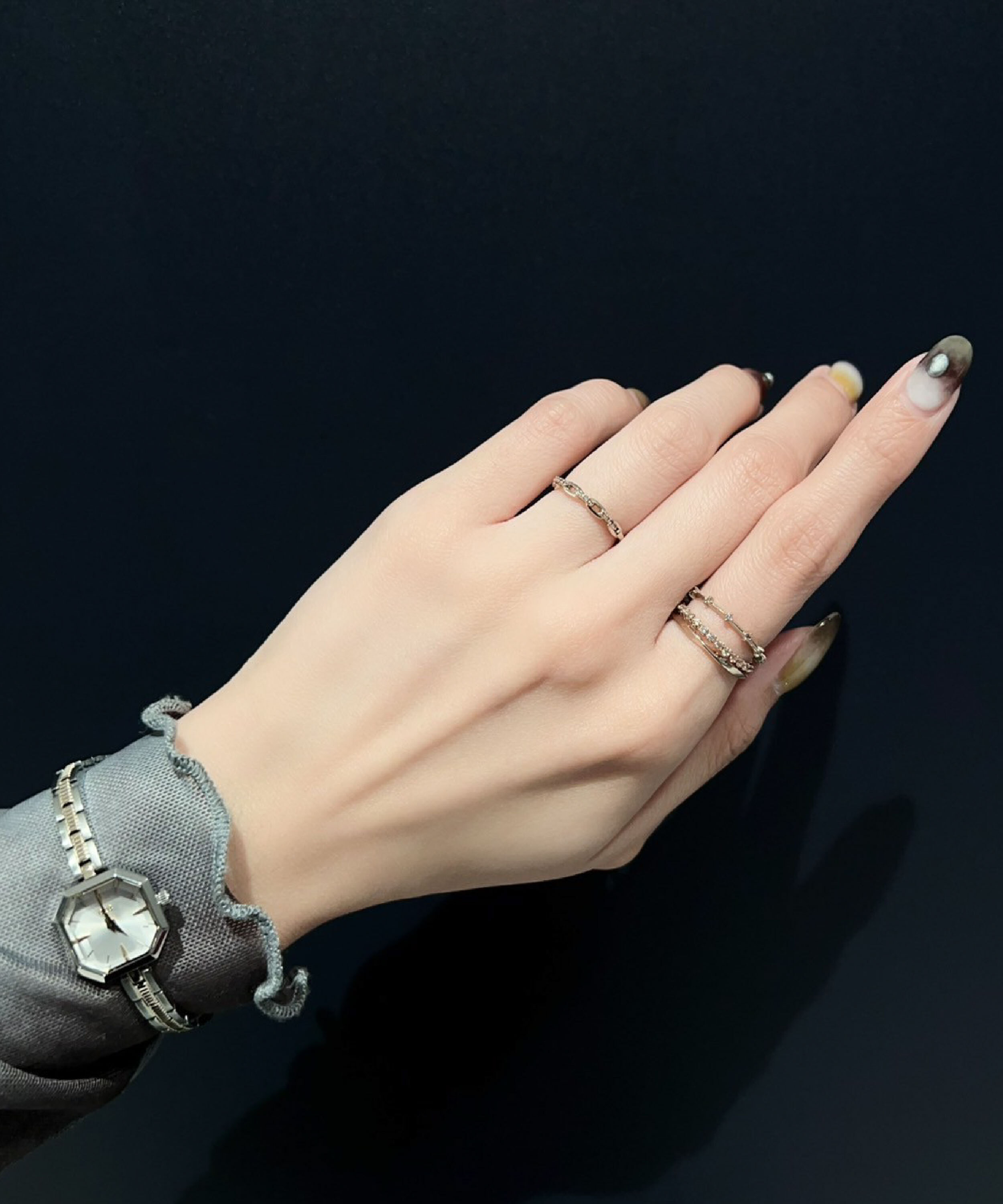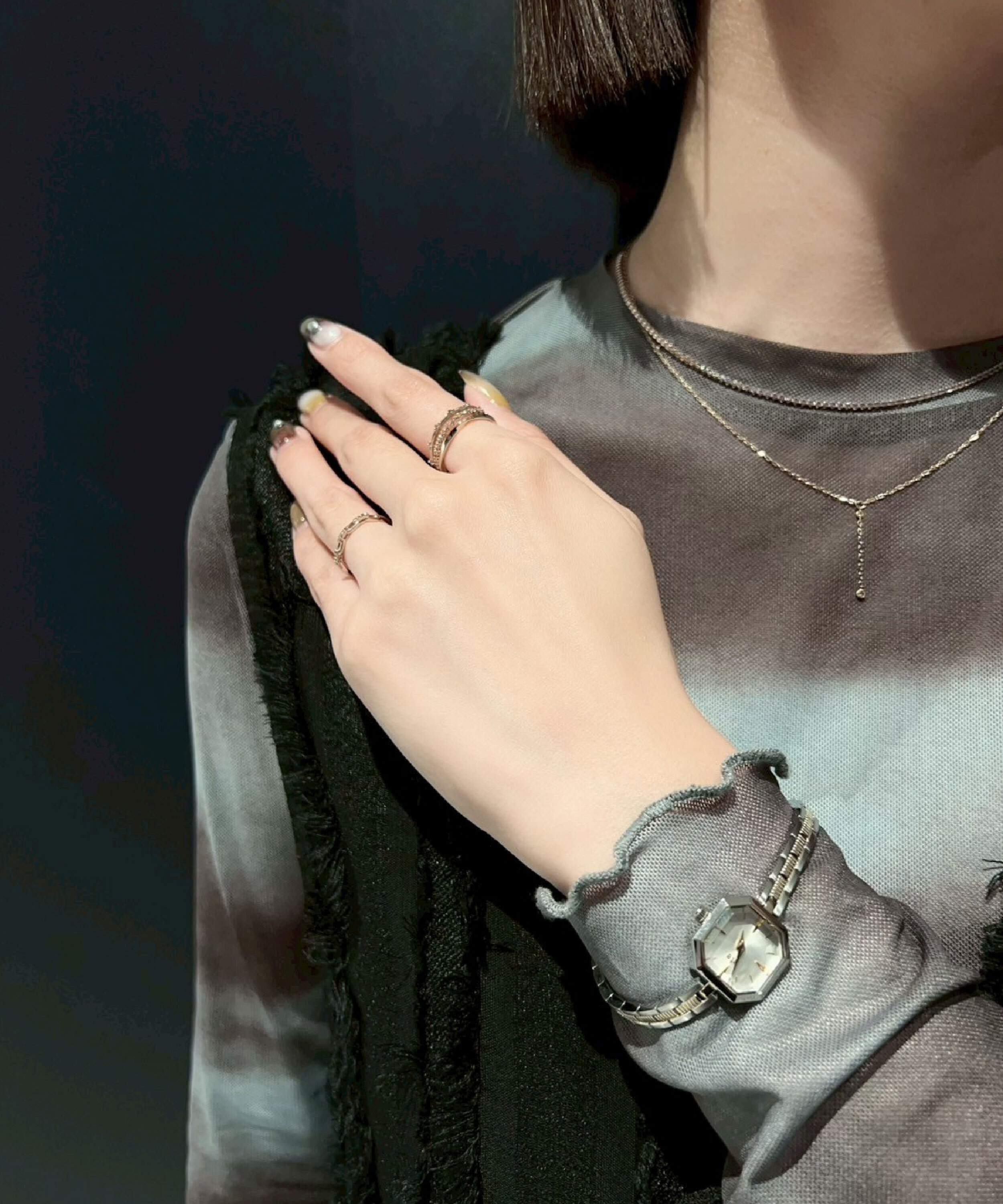 綻放華麗魅力的線形光環寶石系列,搭配在其中都可以為整體造型增添一抹俐落與亮度,多款戒指疊戴,營造層次感,自然散發精緻魅力。 腕錶選擇以古董錶為設計靈感,結合現代美學的細緻刻紋八角腕錶,佩戴時自然修飾腕間線條,舉手投足間流露摩登而自信的氛圍。