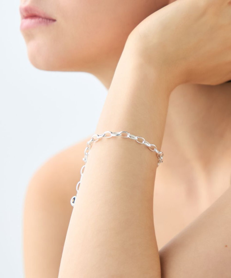 以圓潤可愛的墜飾為亮點,搭配飽滿流暢的曲線鏈條,呈現出既不過於休閒、又帶有高雅氣質的手鍊。