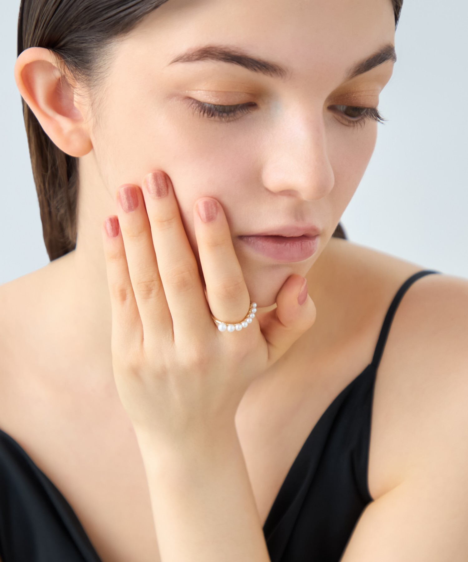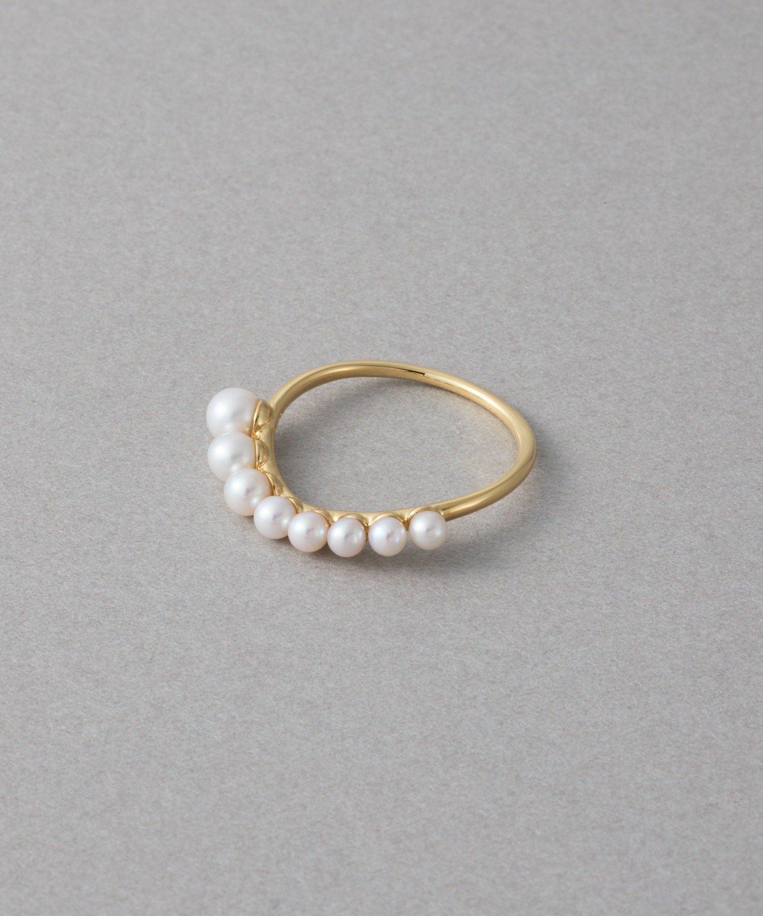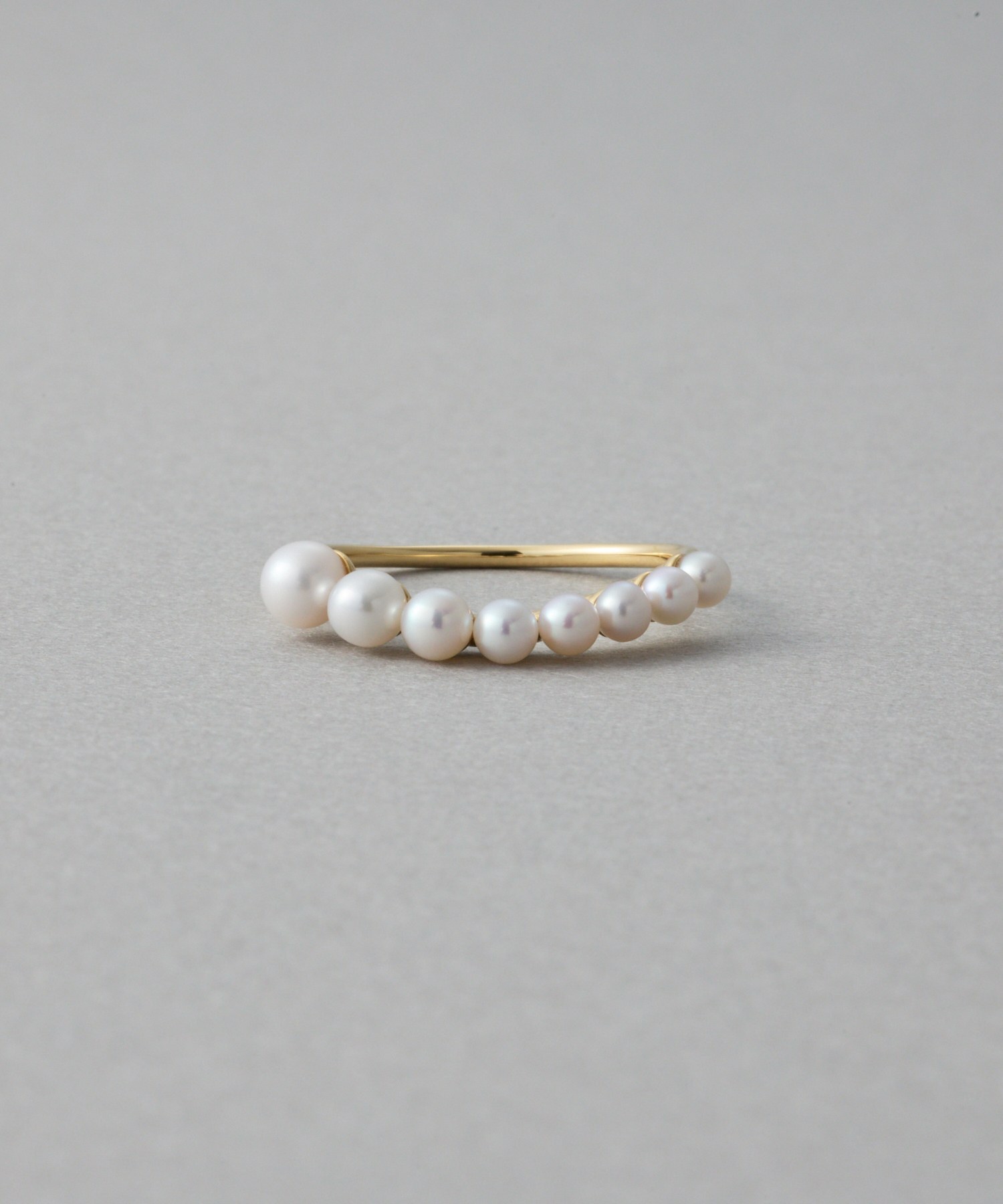 以漸層排列鑲嵌的珍珠,描繪出柔和而優美的線條戒指。
