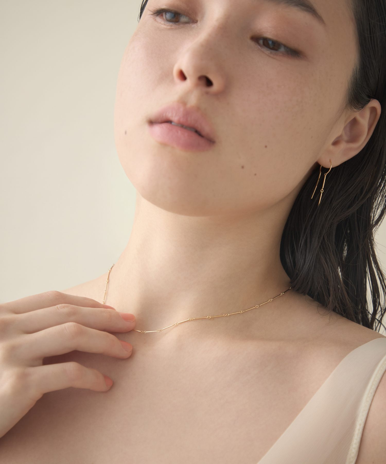 在鎖骨間以細膩光勾勒出簡約優雅的線條。