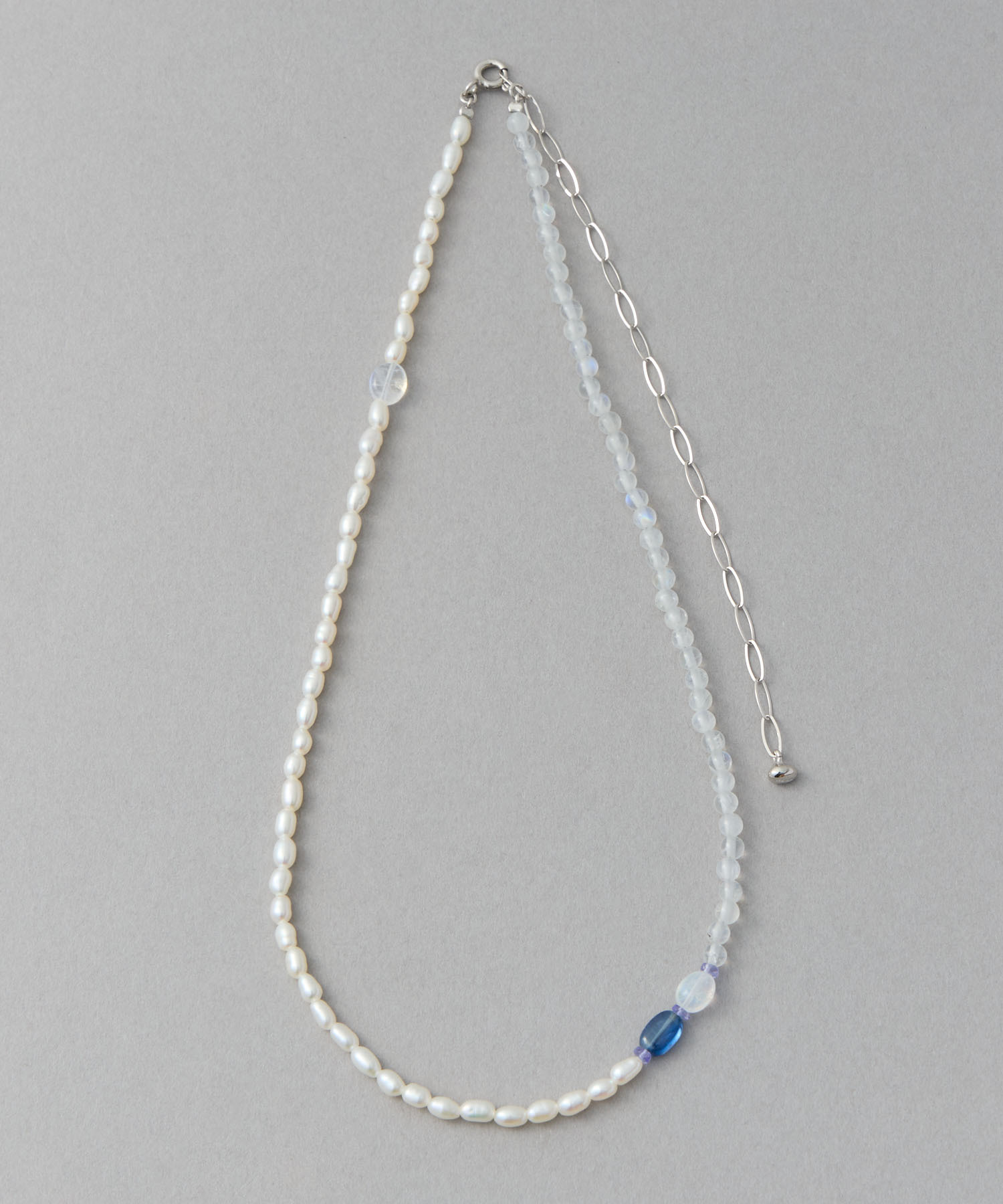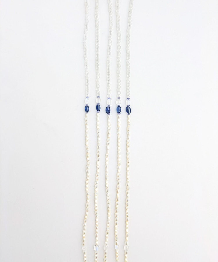 材質:SV925純銀包鉑金塗層(不含鎳,減緩過敏可能性)、淡水珍珠,白色拉長石,藍晶石,坦桑石,月光石